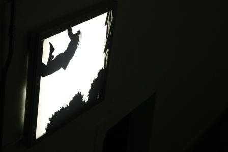 Grey Light.Left and right back, high up, two small windows, curtains drawn.