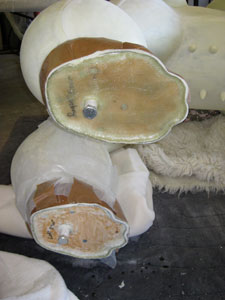 Only room for one person to work so Chris did the shims on the underside of the poodle, very difficult. Then he taped them & put on a layer of rubber.