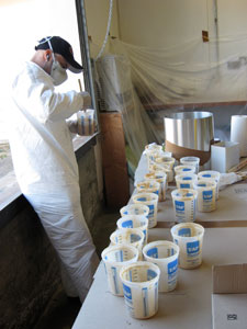 Jose cleaned all the measuring containers and cut the flashing for the parting lines.